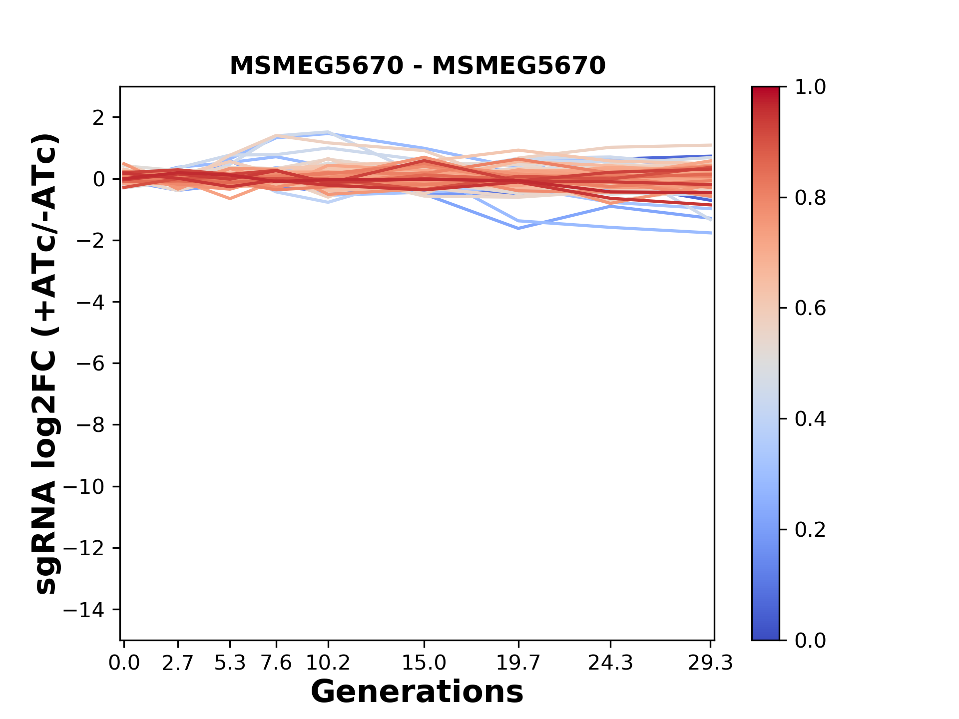 Here, we show sgRNA log2 fold-change values (L2FC) (plus versus minus ATc) over consecutive generations for sgRNAs targeting the gene you selected.