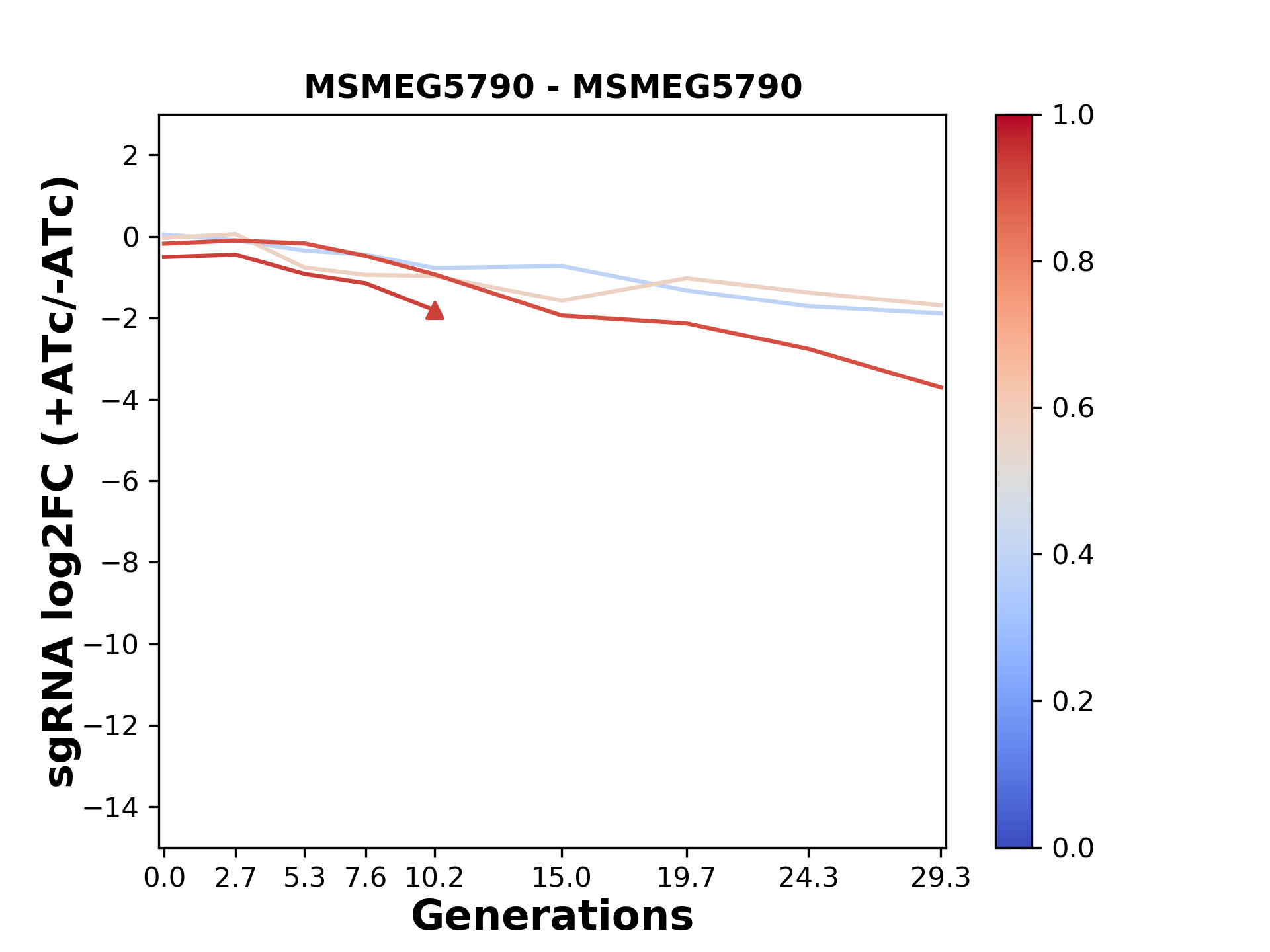Here, we show sgRNA log2 fold-change values (L2FC) (plus versus minus ATc) over consecutive generations for sgRNAs targeting the gene you selected.