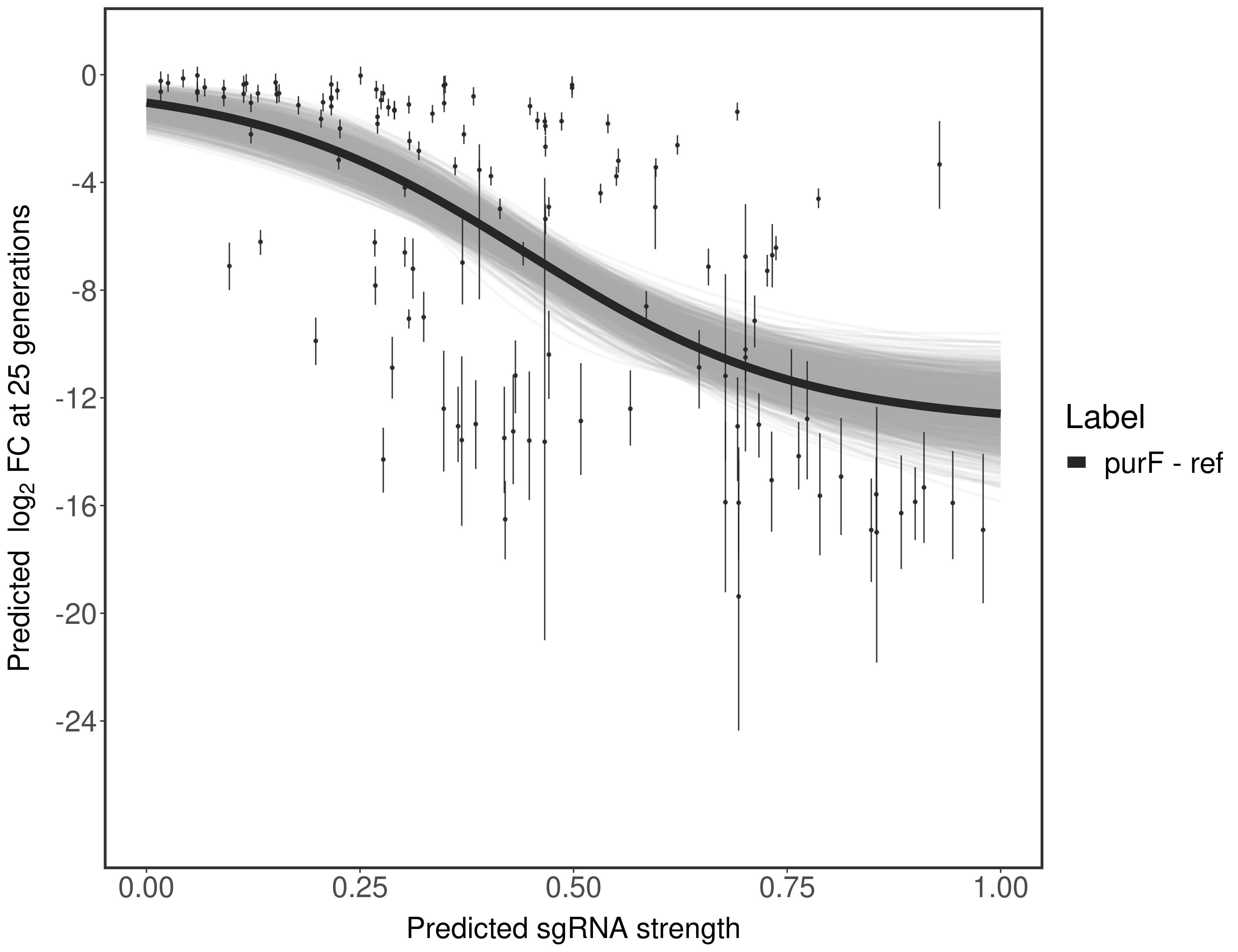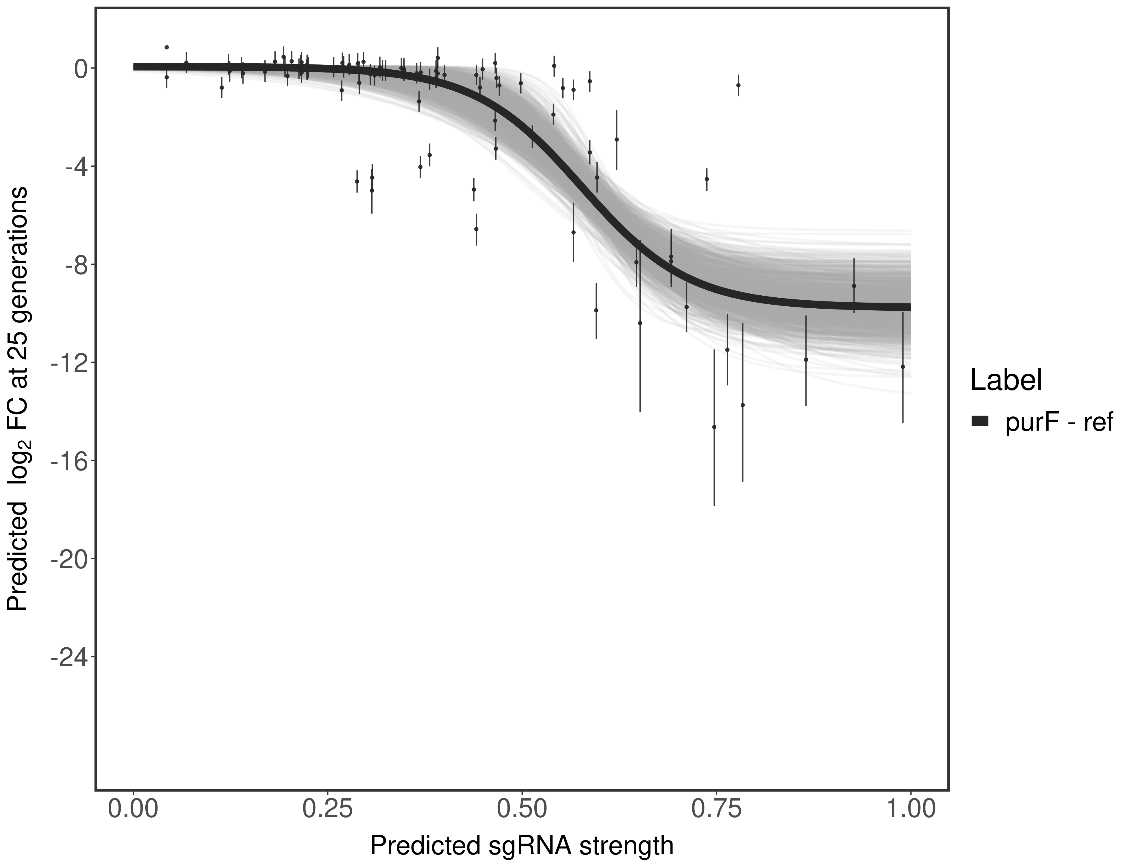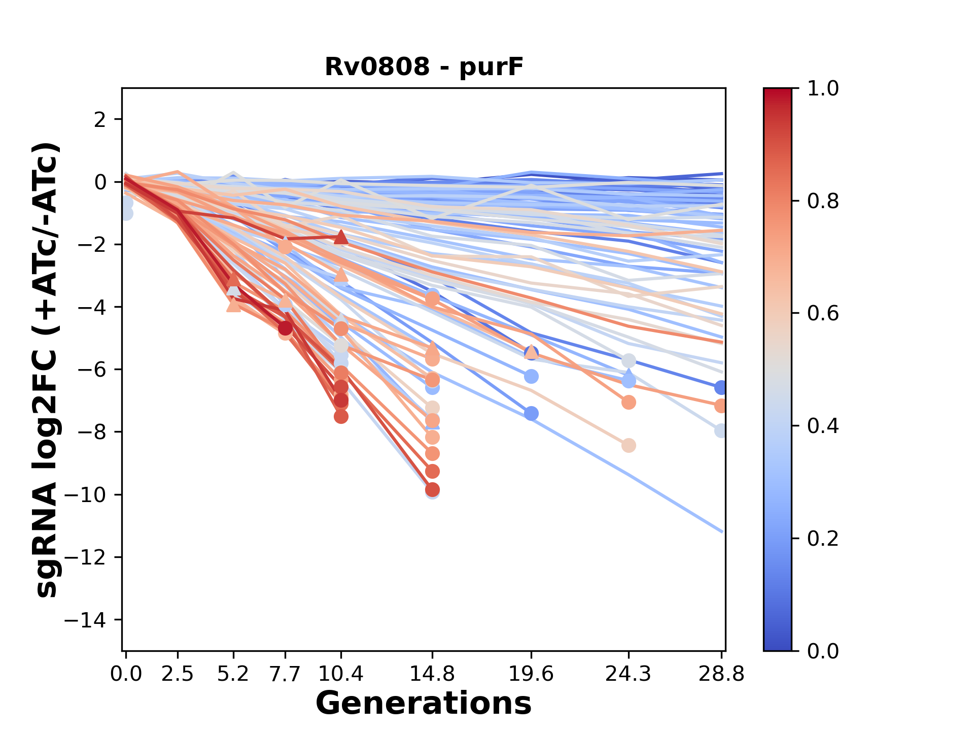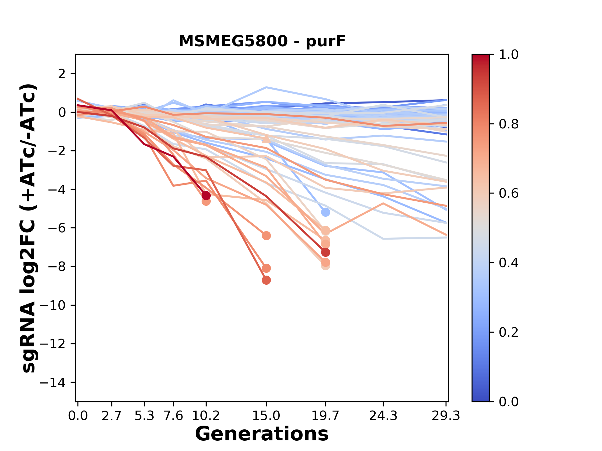 Here, we show sgRNA log2 fold-change values (L2FC) (plus versus minus ATc) over consecutive generations for sgRNAs targeting the gene you selected.