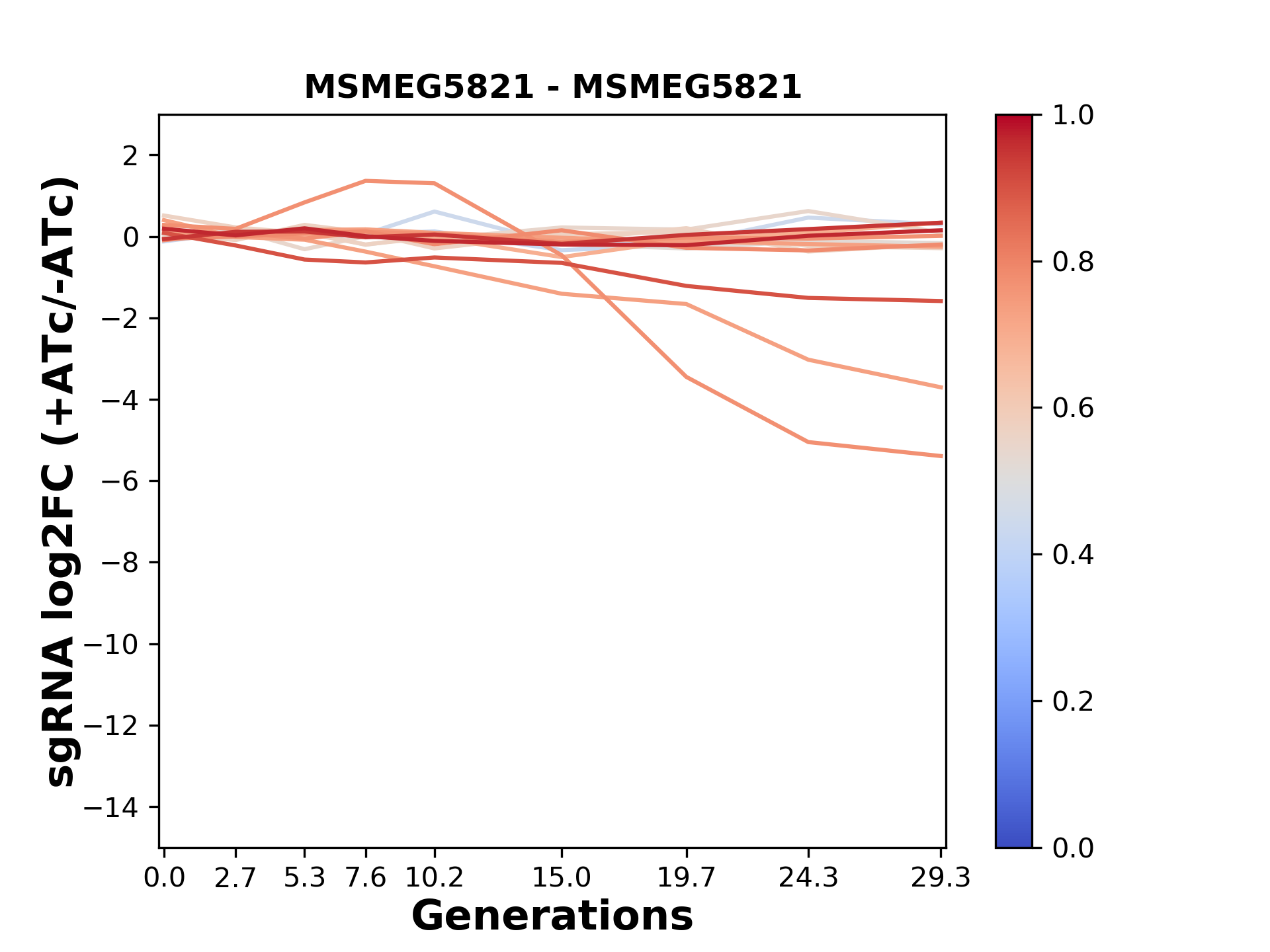 Here, we show sgRNA log2 fold-change values (L2FC) (plus versus minus ATc) over consecutive generations for sgRNAs targeting the gene you selected.