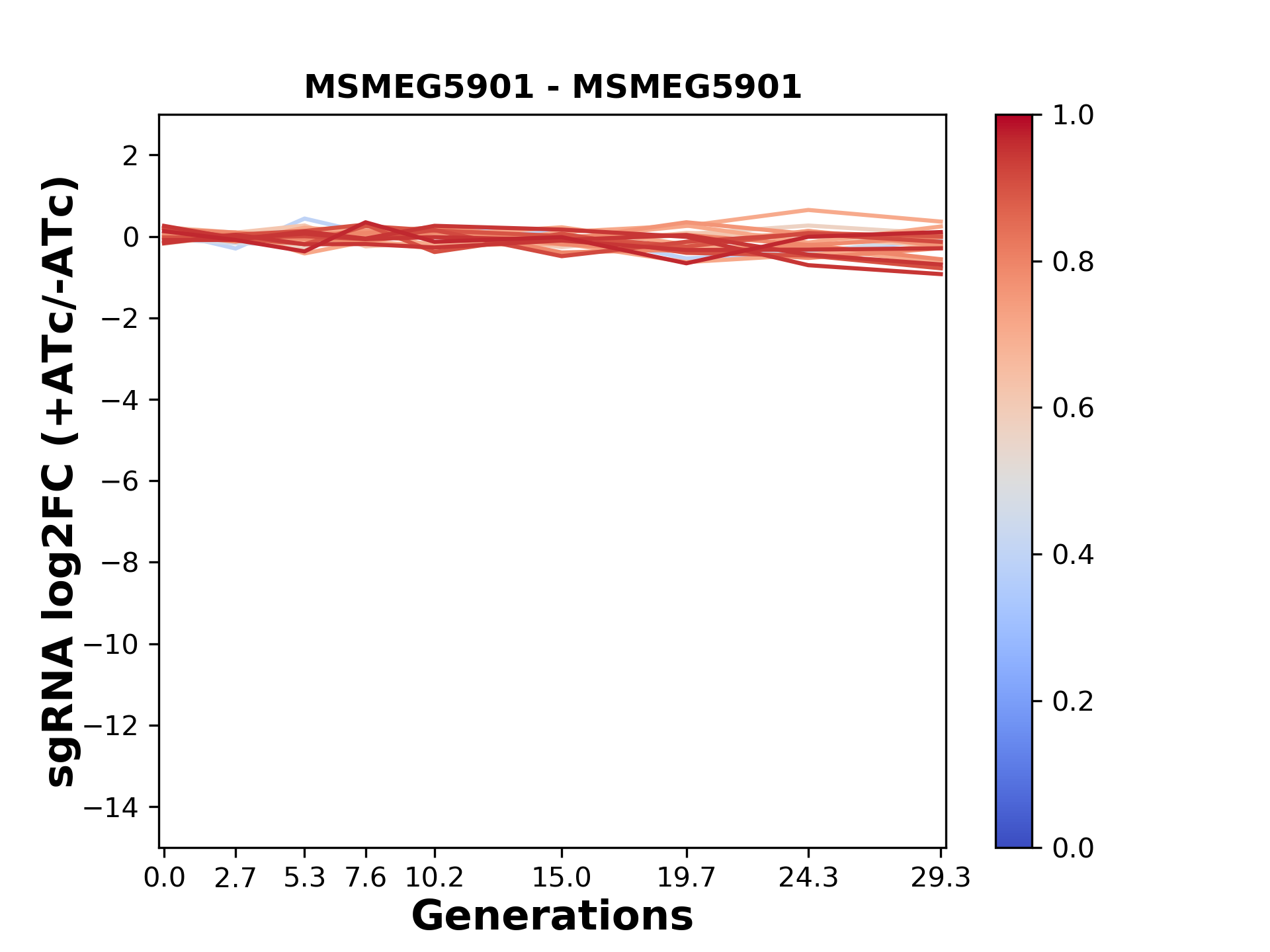 Here, we show sgRNA log2 fold-change values (L2FC) (plus versus minus ATc) over consecutive generations for sgRNAs targeting the gene you selected.