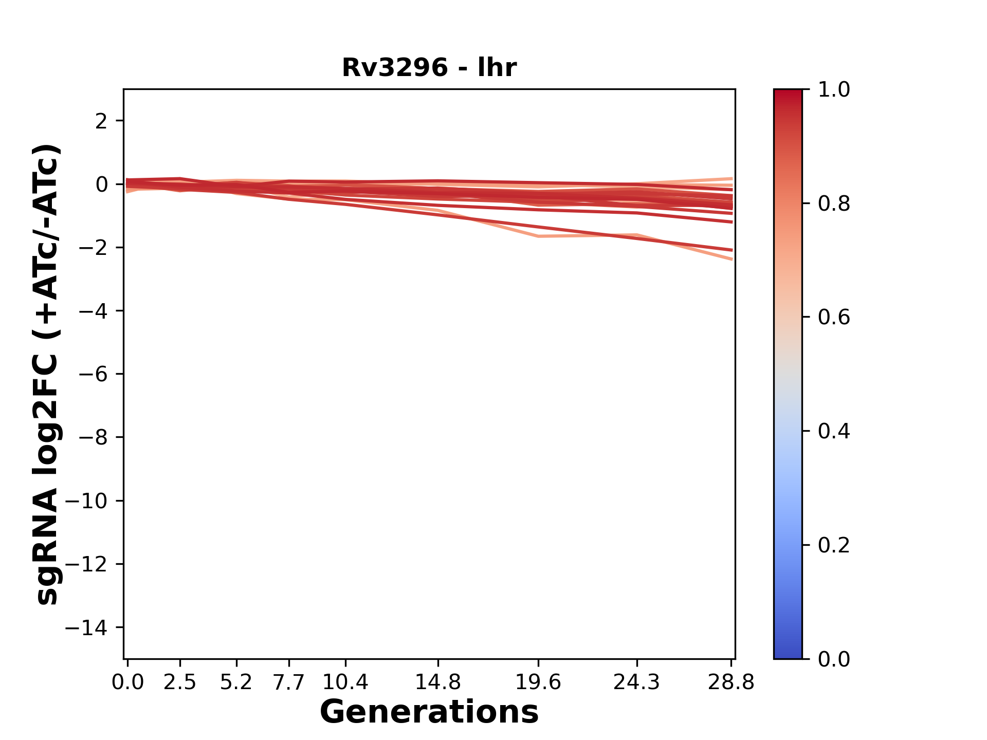 Here, we show sgRNA log2 fold-change values (L2FC) (plus versus minus ATc) over consecutive generations for sgRNAs targeting the gene you selected.