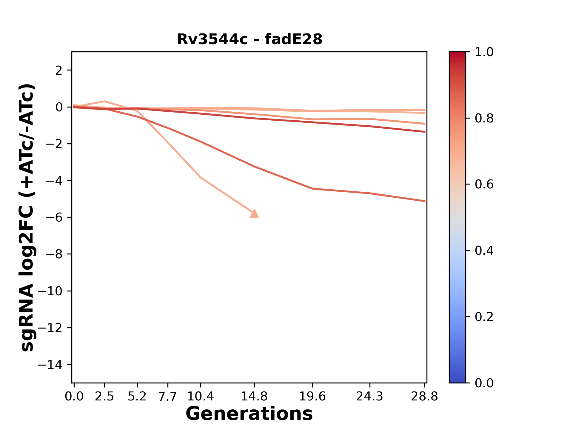 Here, we show sgRNA log2 fold-change values (L2FC) (plus versus minus ATc) over consecutive generations for sgRNAs targeting the gene you selected.