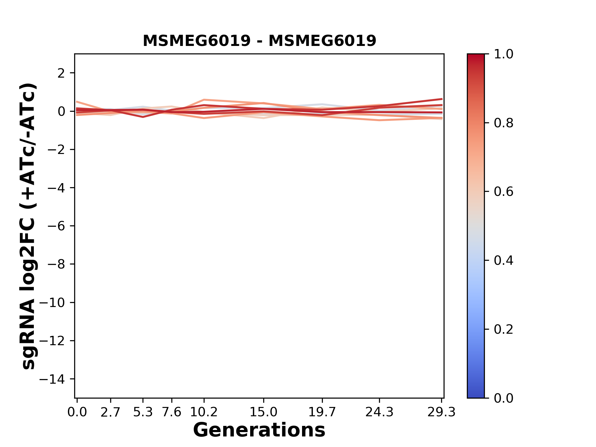Here, we show sgRNA log2 fold-change values (L2FC) (plus versus minus ATc) over consecutive generations for sgRNAs targeting the gene you selected.