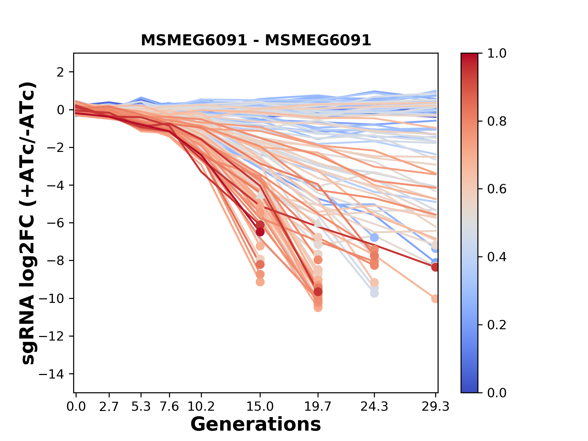 Here, we show sgRNA log2 fold-change values (L2FC) (plus versus minus ATc) over consecutive generations for sgRNAs targeting the gene you selected.
