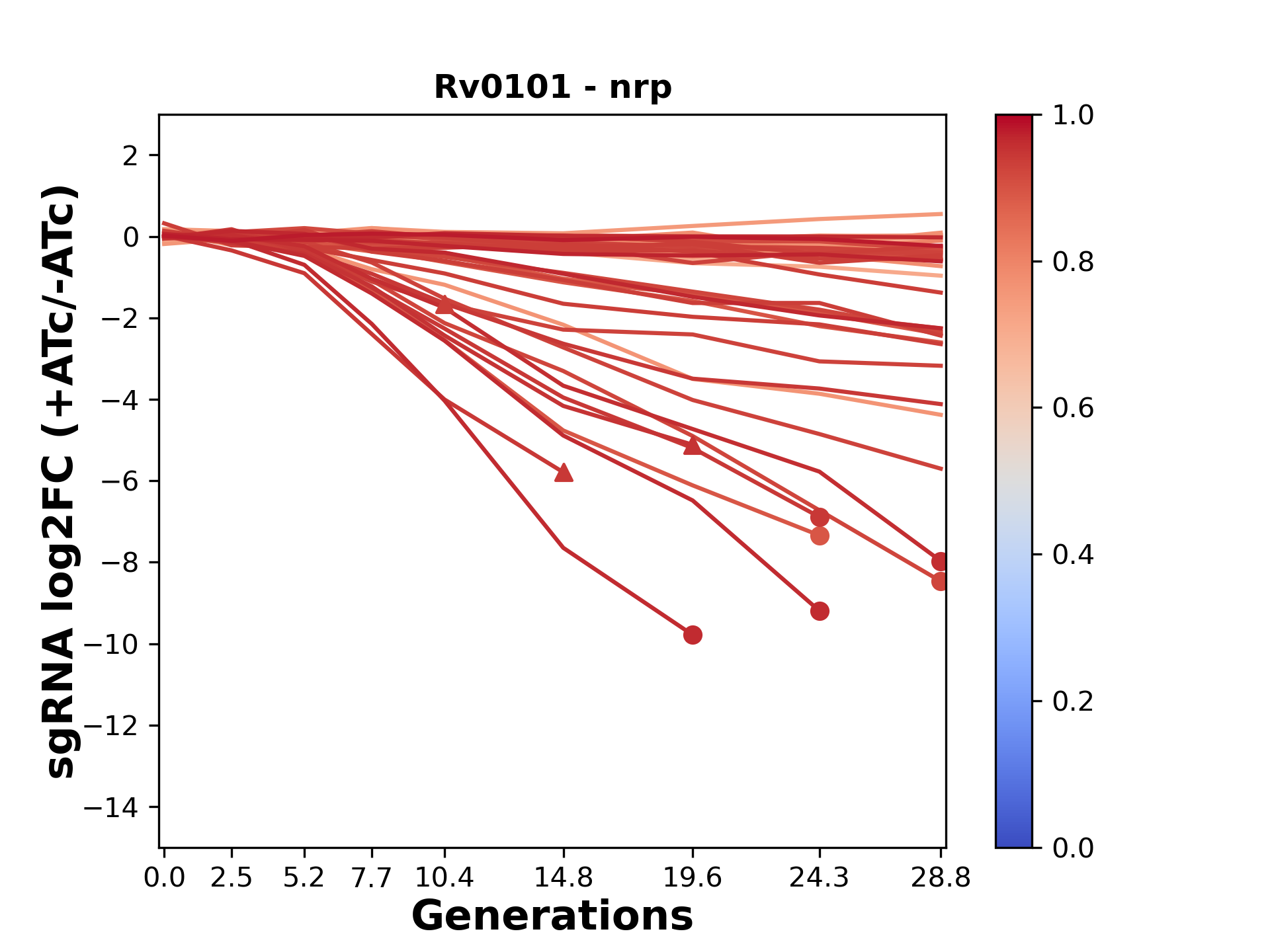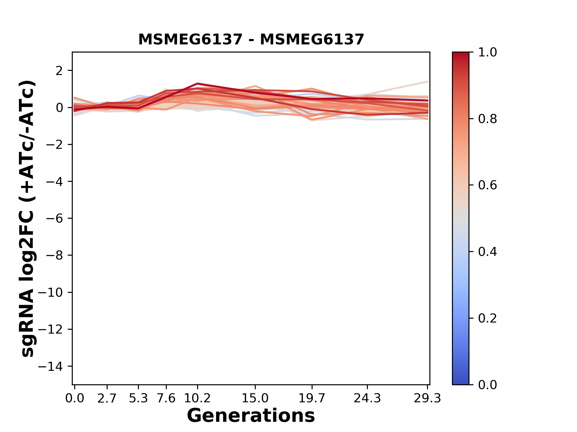 Here, we show sgRNA log2 fold-change values (L2FC) (plus versus minus ATc) over consecutive generations for sgRNAs targeting the gene you selected.