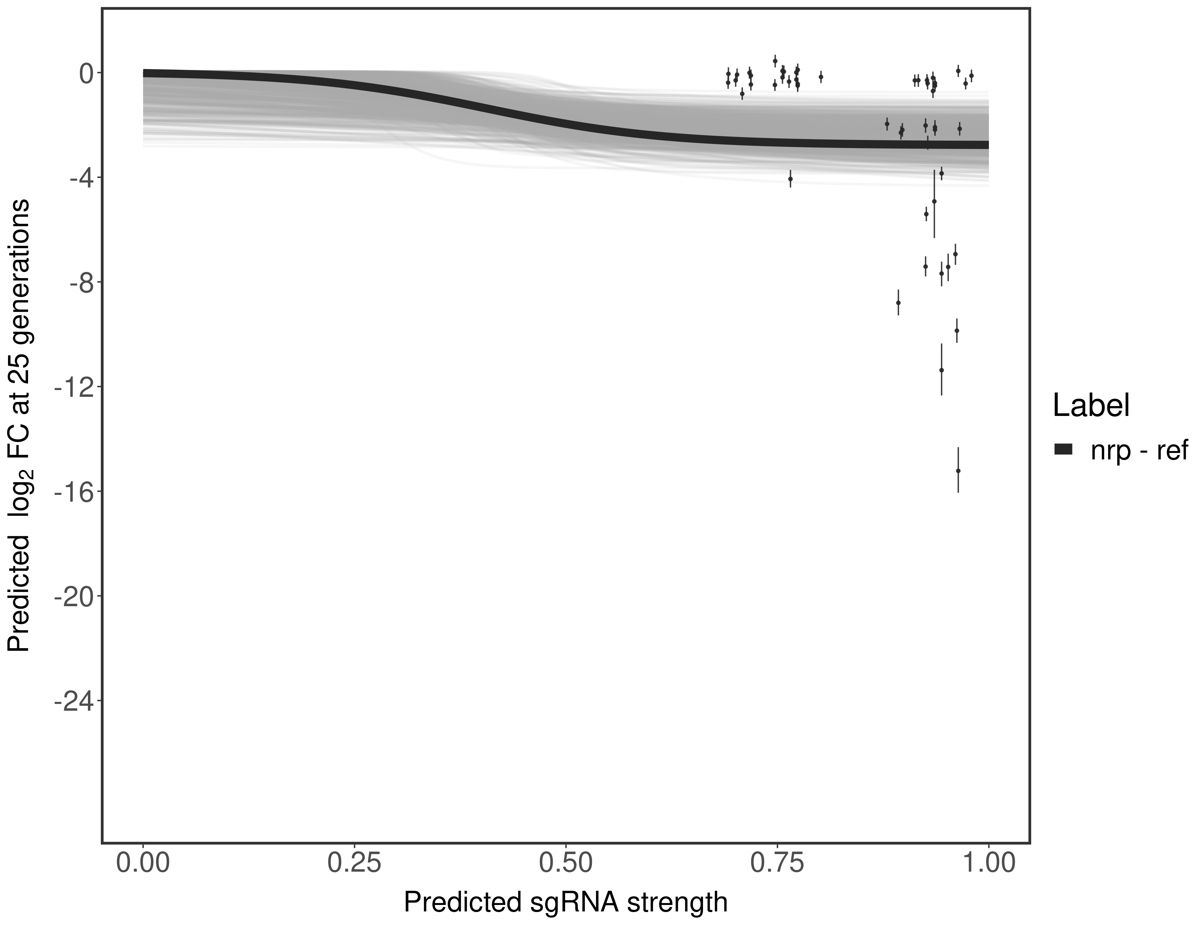 In order to quantify gene vulnerability, data were subsequently analyzed with a hierarchical model at the sgRNA level (two-line model) and gene level (Hill curve). The vulnerability quantification is shown below. [More information]