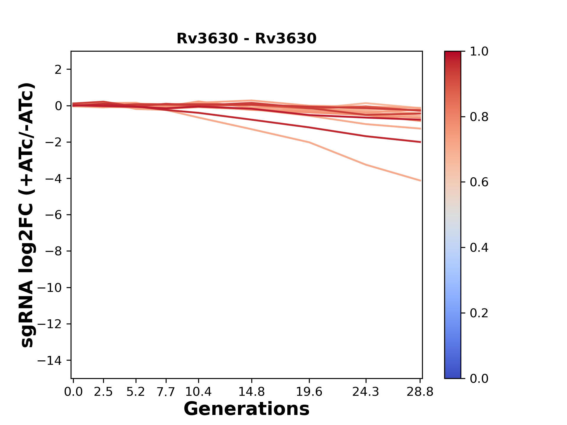 Here, we show sgRNA log2 fold-change values (L2FC) (plus versus minus ATc) over consecutive generations for sgRNAs targeting the gene you selected.
