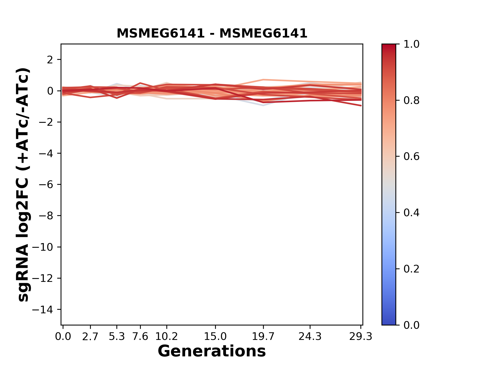 Here, we show sgRNA log2 fold-change values (L2FC) (plus versus minus ATc) over consecutive generations for sgRNAs targeting the gene you selected.