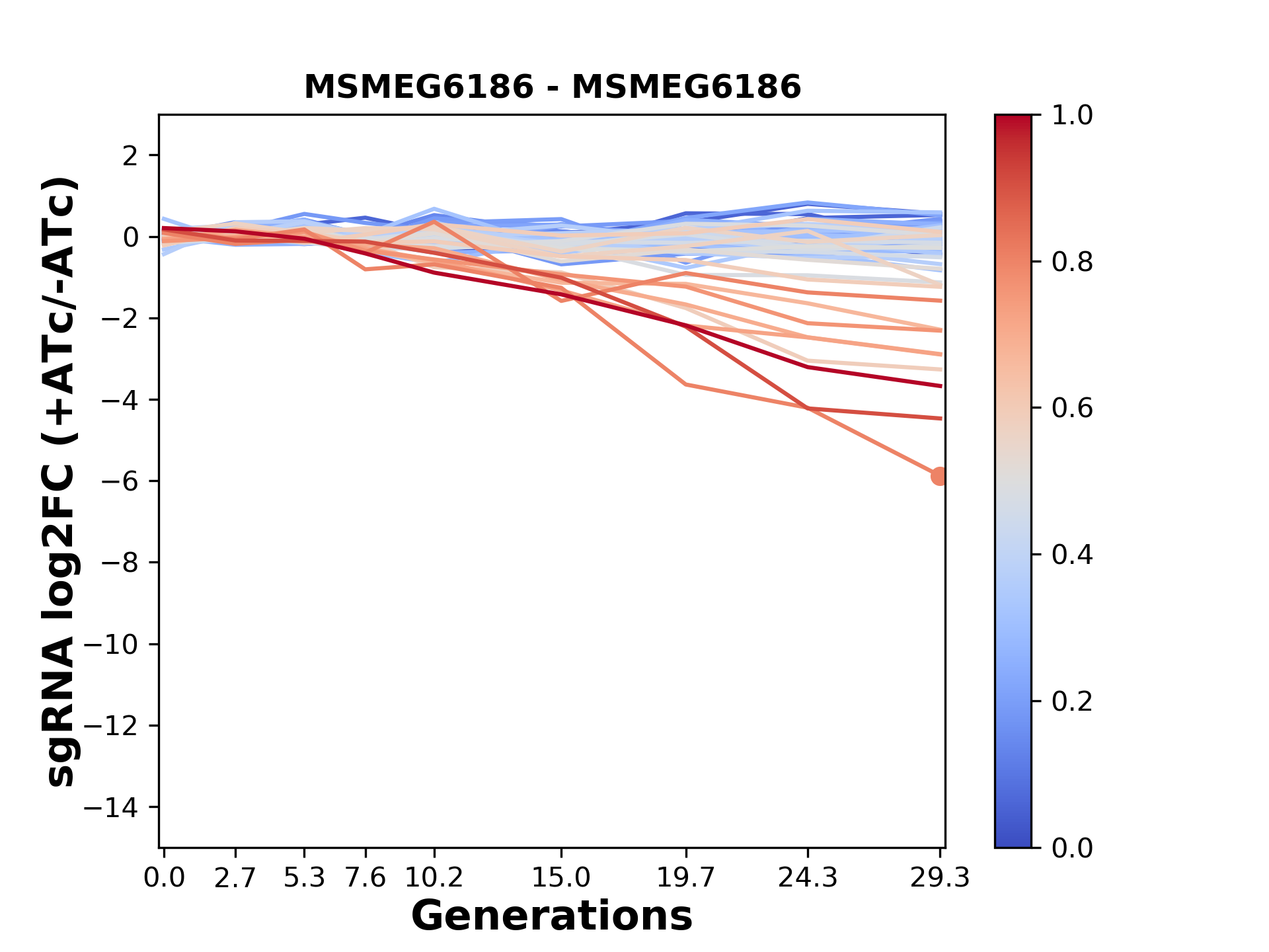 Here, we show sgRNA log2 fold-change values (L2FC) (plus versus minus ATc) over consecutive generations for sgRNAs targeting the gene you selected.