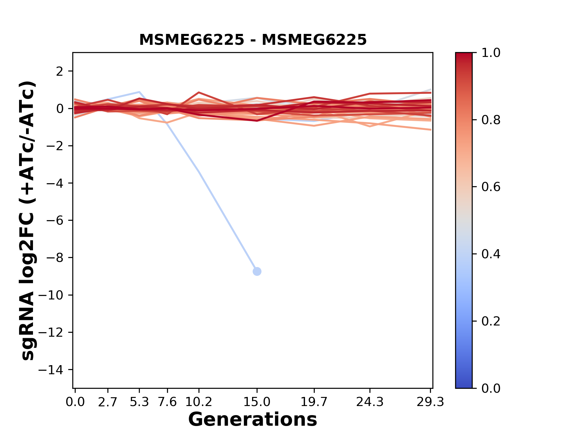 Here, we show sgRNA log2 fold-change values (L2FC) (plus versus minus ATc) over consecutive generations for sgRNAs targeting the gene you selected.