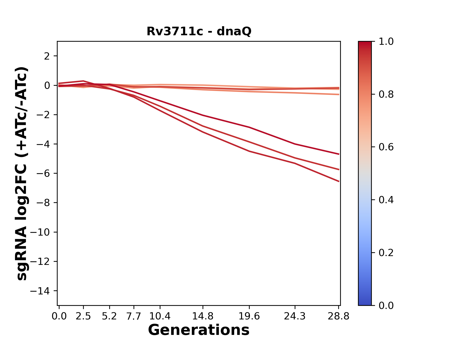 Here, we show sgRNA log2 fold-change values (L2FC) (plus versus minus ATc) over consecutive generations for sgRNAs targeting the gene you selected.