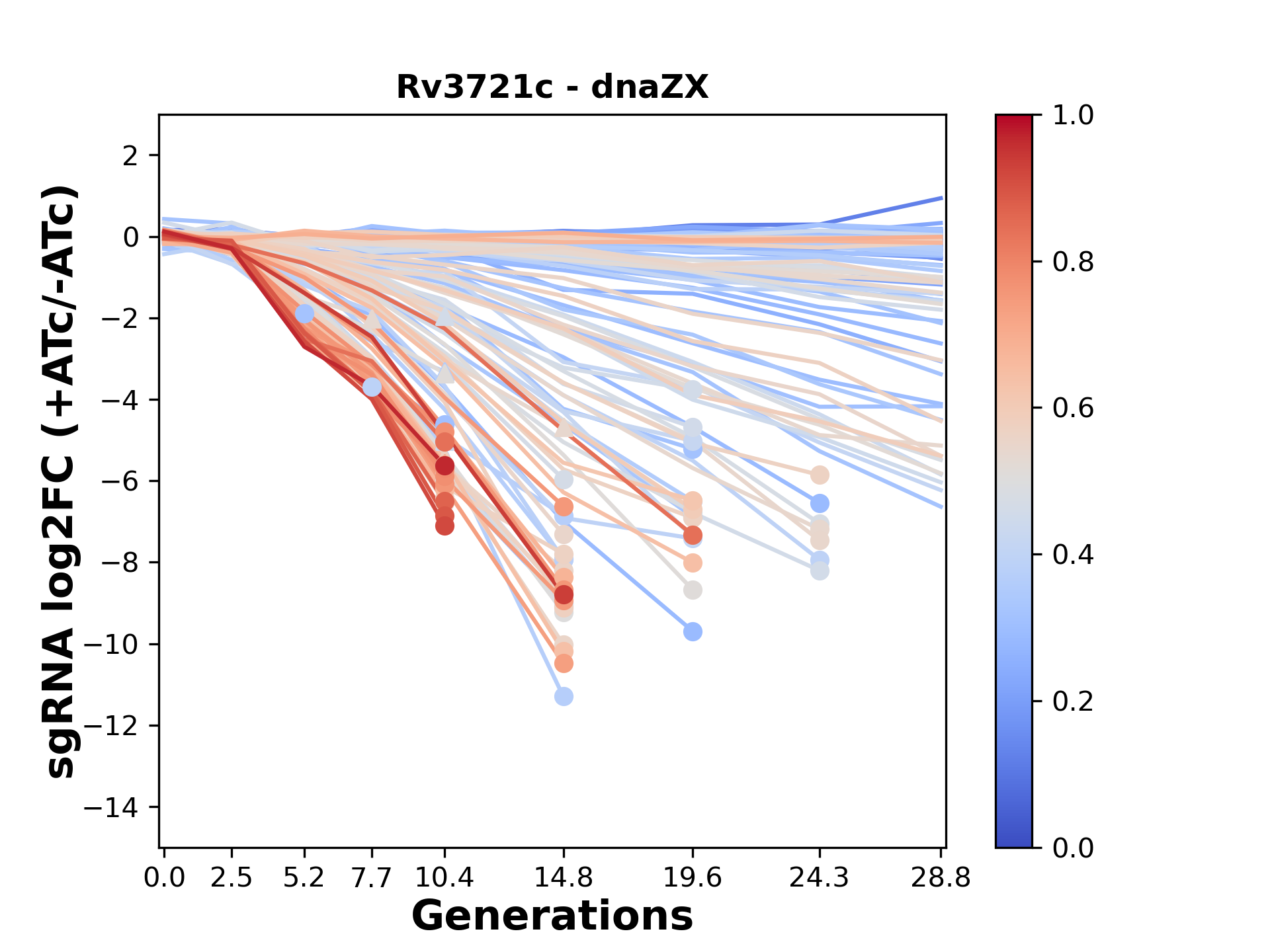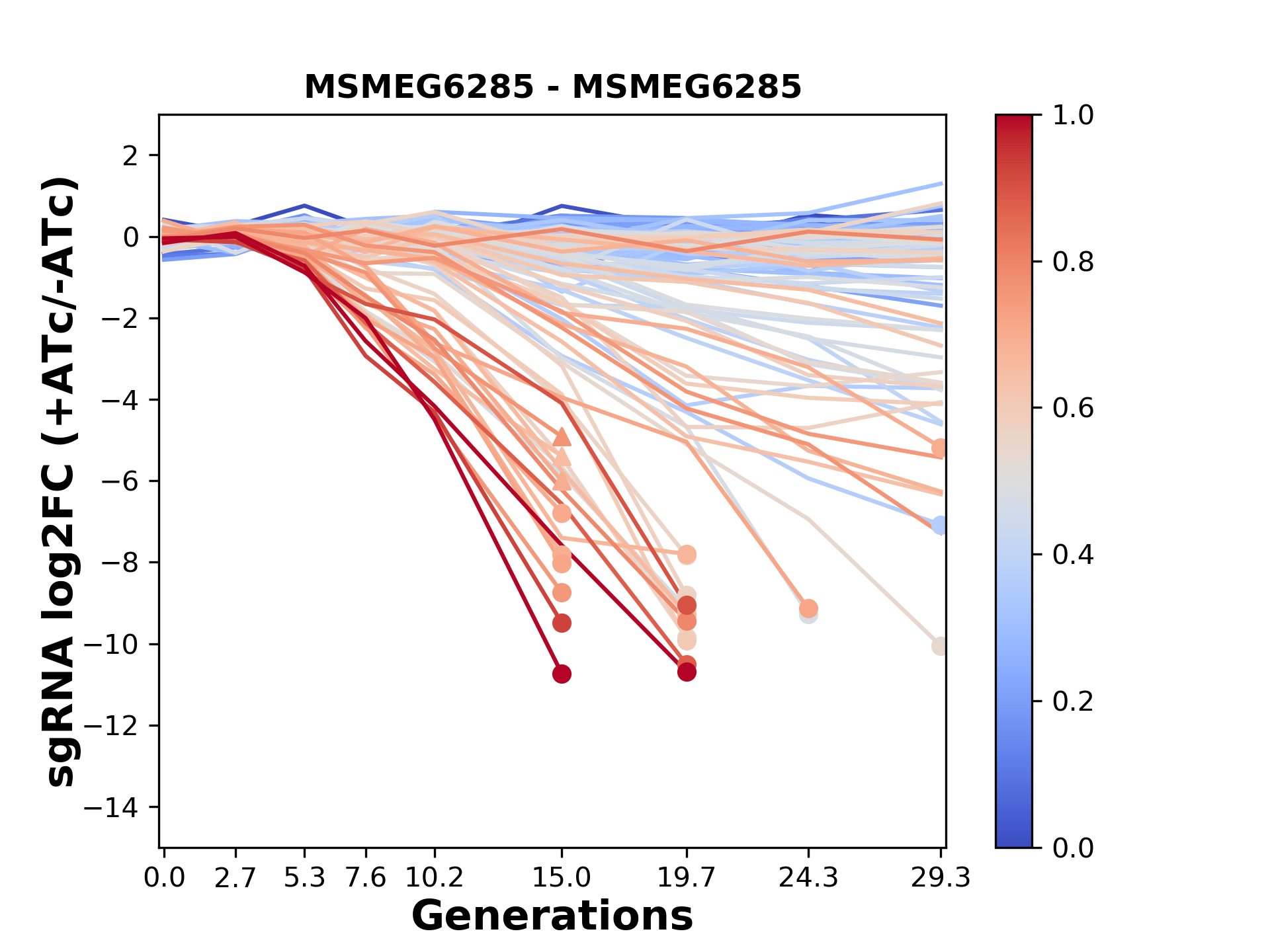 Here, we show sgRNA log2 fold-change values (L2FC) (plus versus minus ATc) over consecutive generations for sgRNAs targeting the gene you selected.
