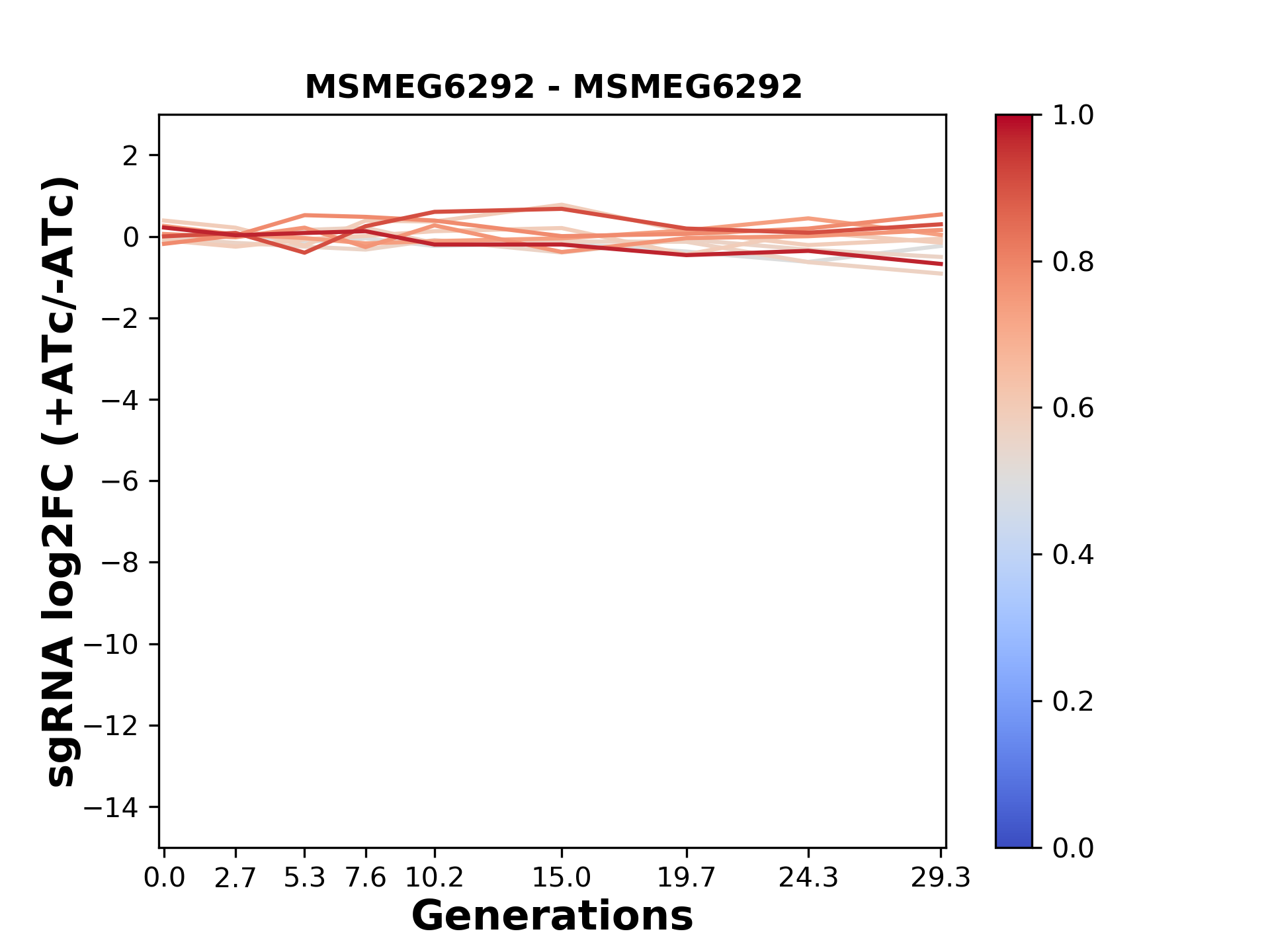 Here, we show sgRNA log2 fold-change values (L2FC) (plus versus minus ATc) over consecutive generations for sgRNAs targeting the gene you selected.
