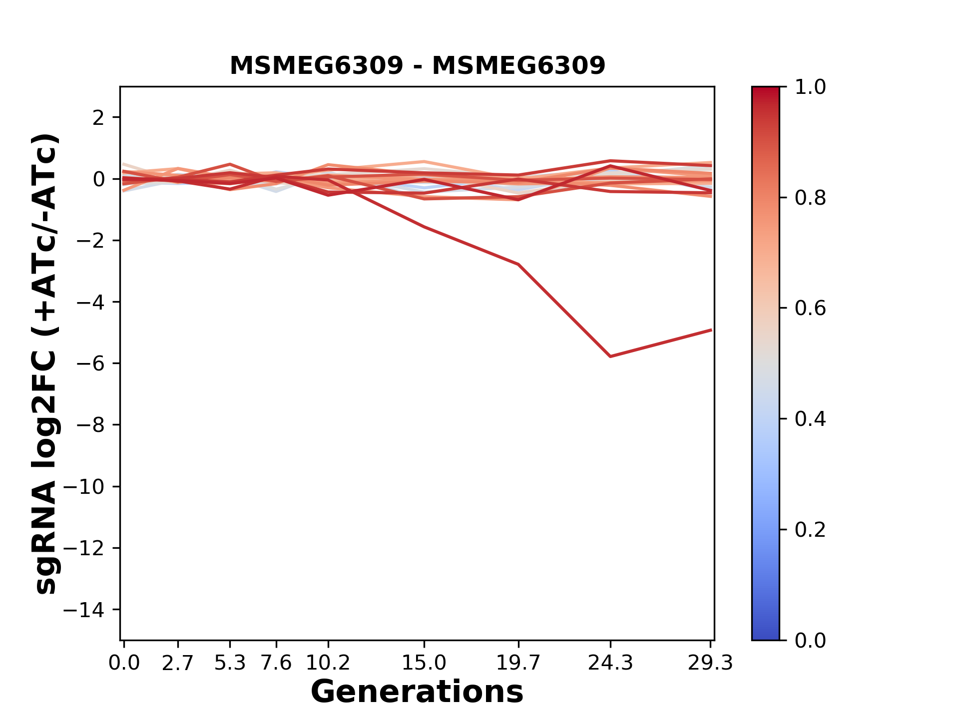 Here, we show sgRNA log2 fold-change values (L2FC) (plus versus minus ATc) over consecutive generations for sgRNAs targeting the gene you selected.