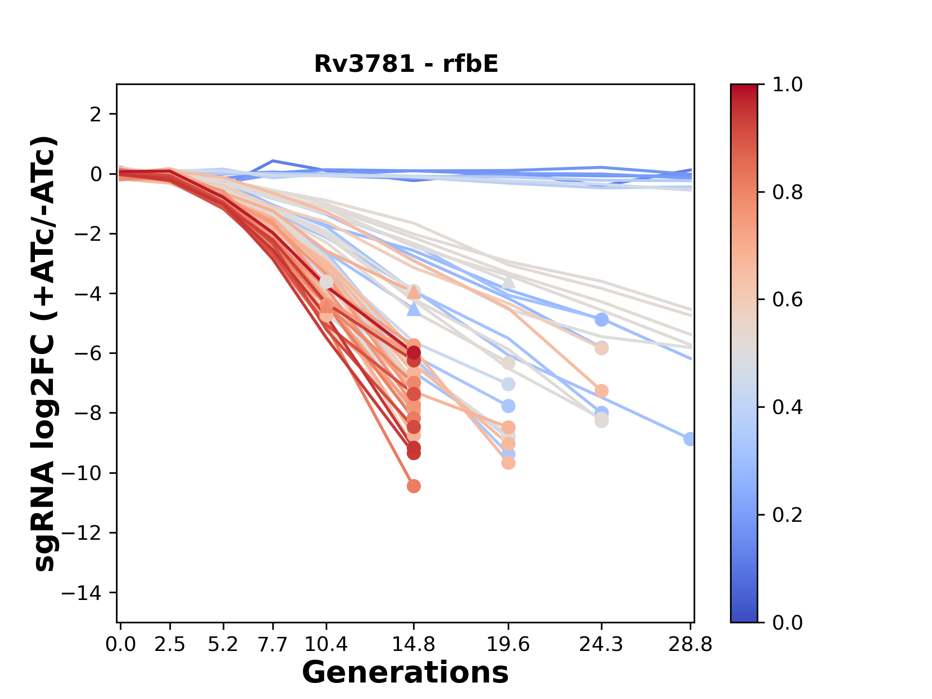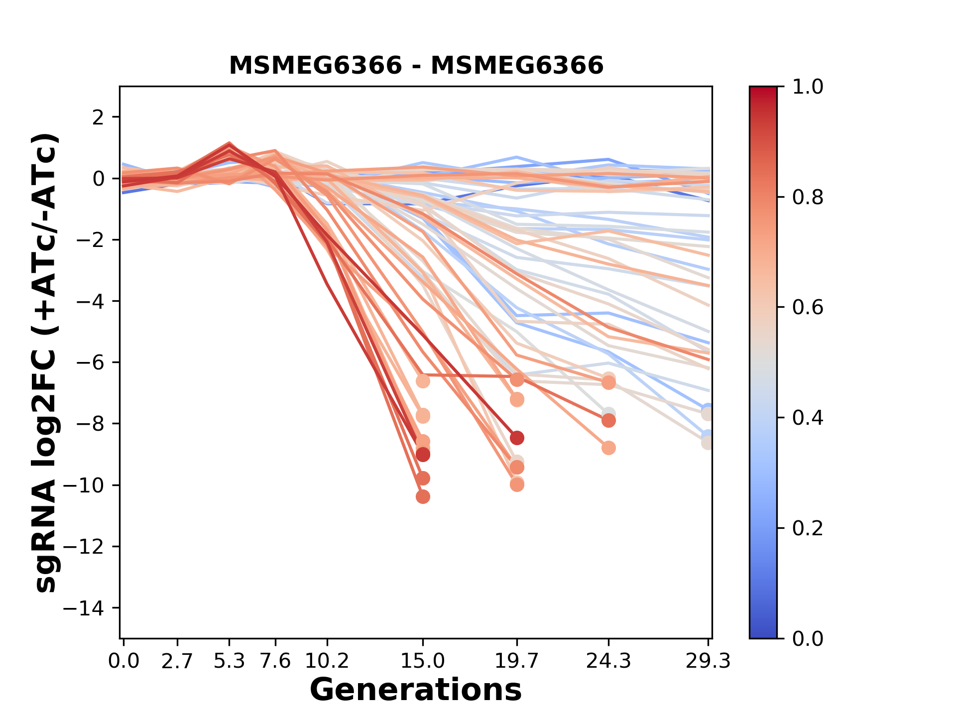 Here, we show sgRNA log2 fold-change values (L2FC) (plus versus minus ATc) over consecutive generations for sgRNAs targeting the gene you selected.