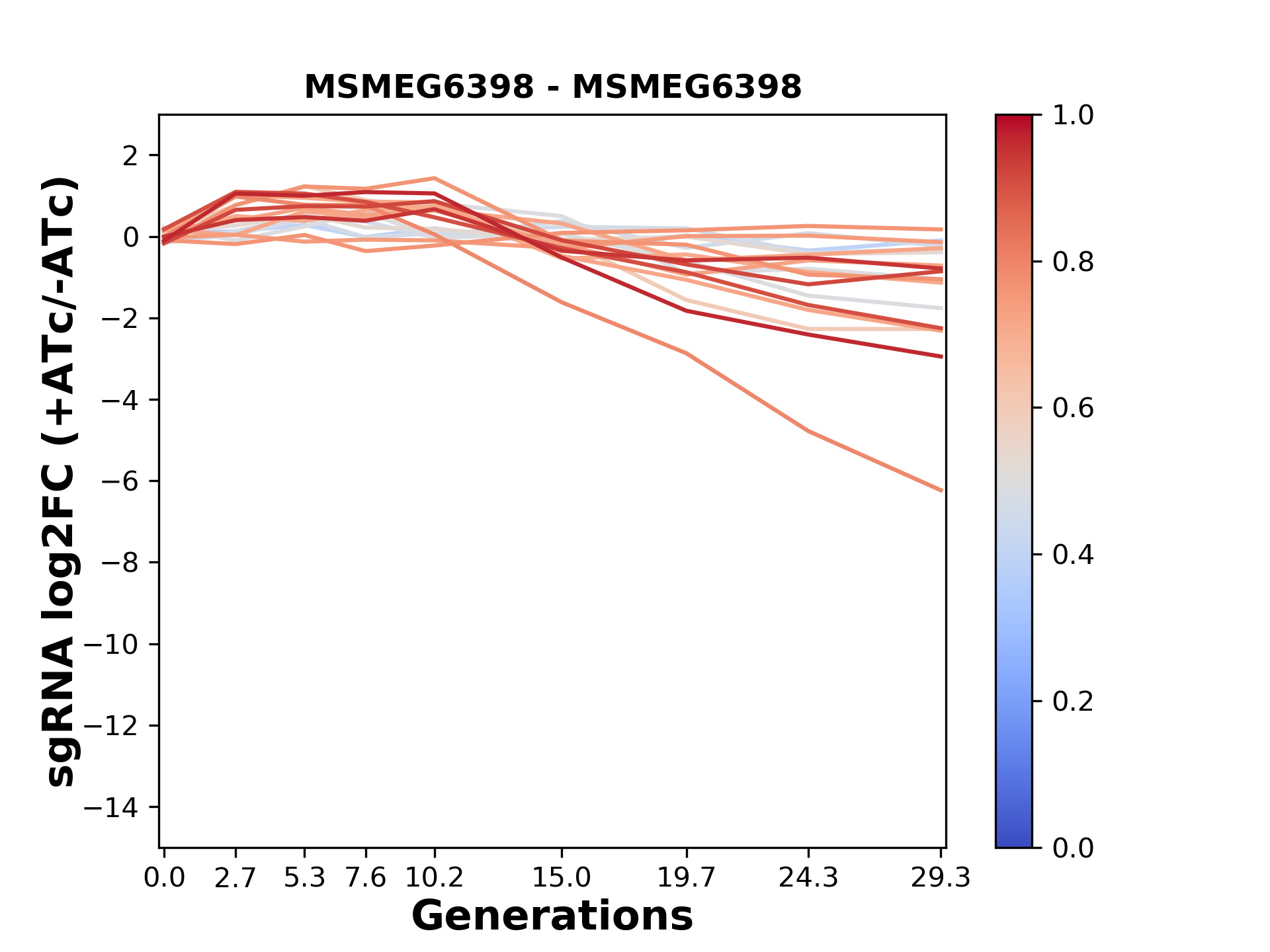 Here, we show sgRNA log2 fold-change values (L2FC) (plus versus minus ATc) over consecutive generations for sgRNAs targeting the gene you selected.