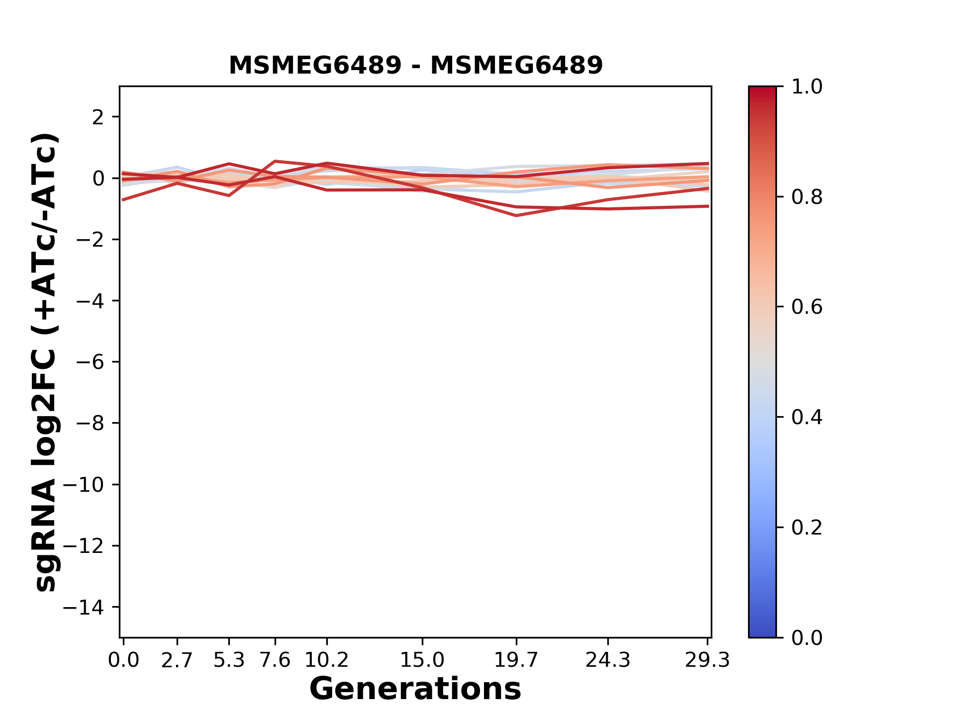 Here, we show sgRNA log2 fold-change values (L2FC) (plus versus minus ATc) over consecutive generations for sgRNAs targeting the gene you selected.