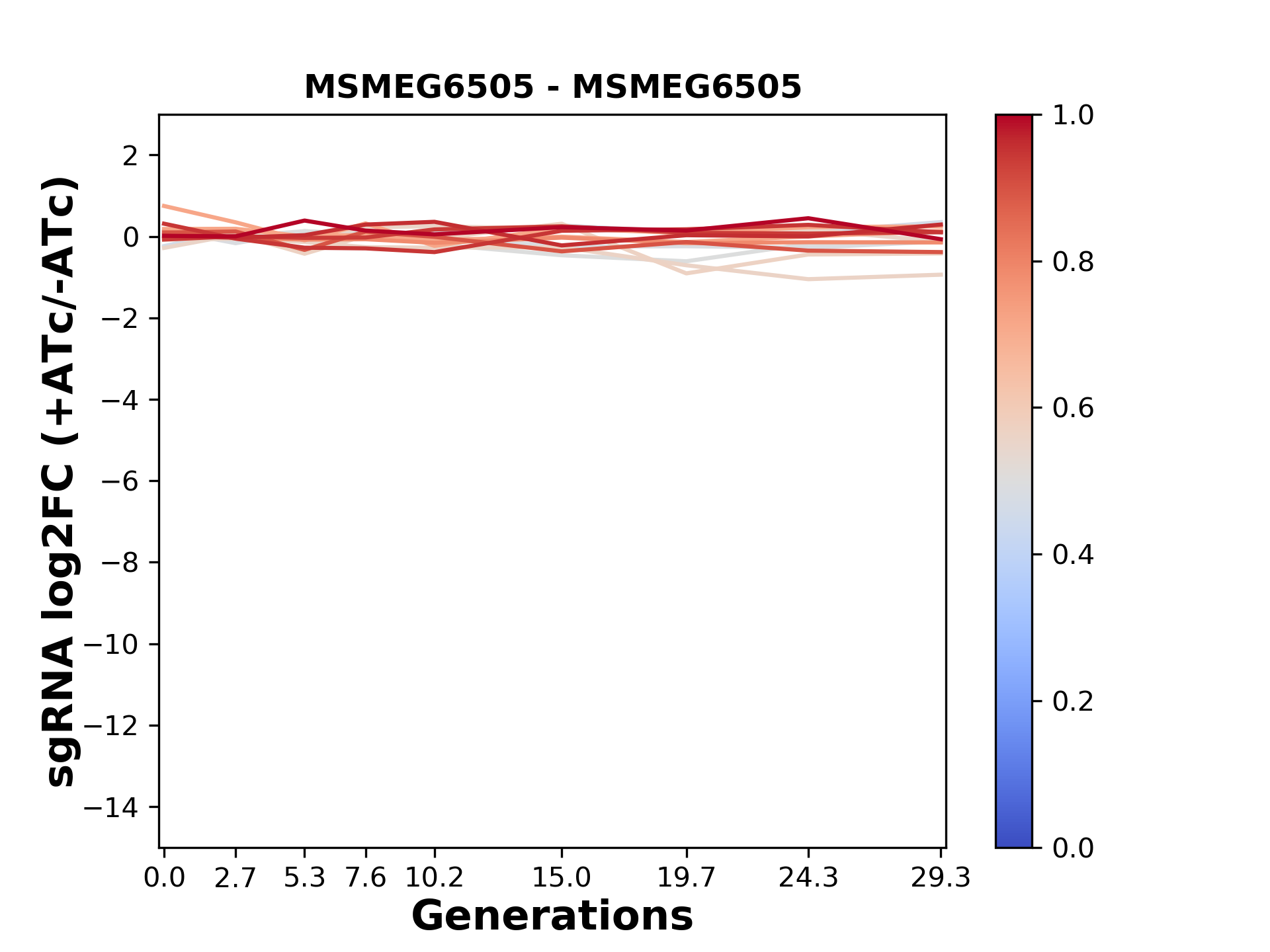 Here, we show sgRNA log2 fold-change values (L2FC) (plus versus minus ATc) over consecutive generations for sgRNAs targeting the gene you selected.