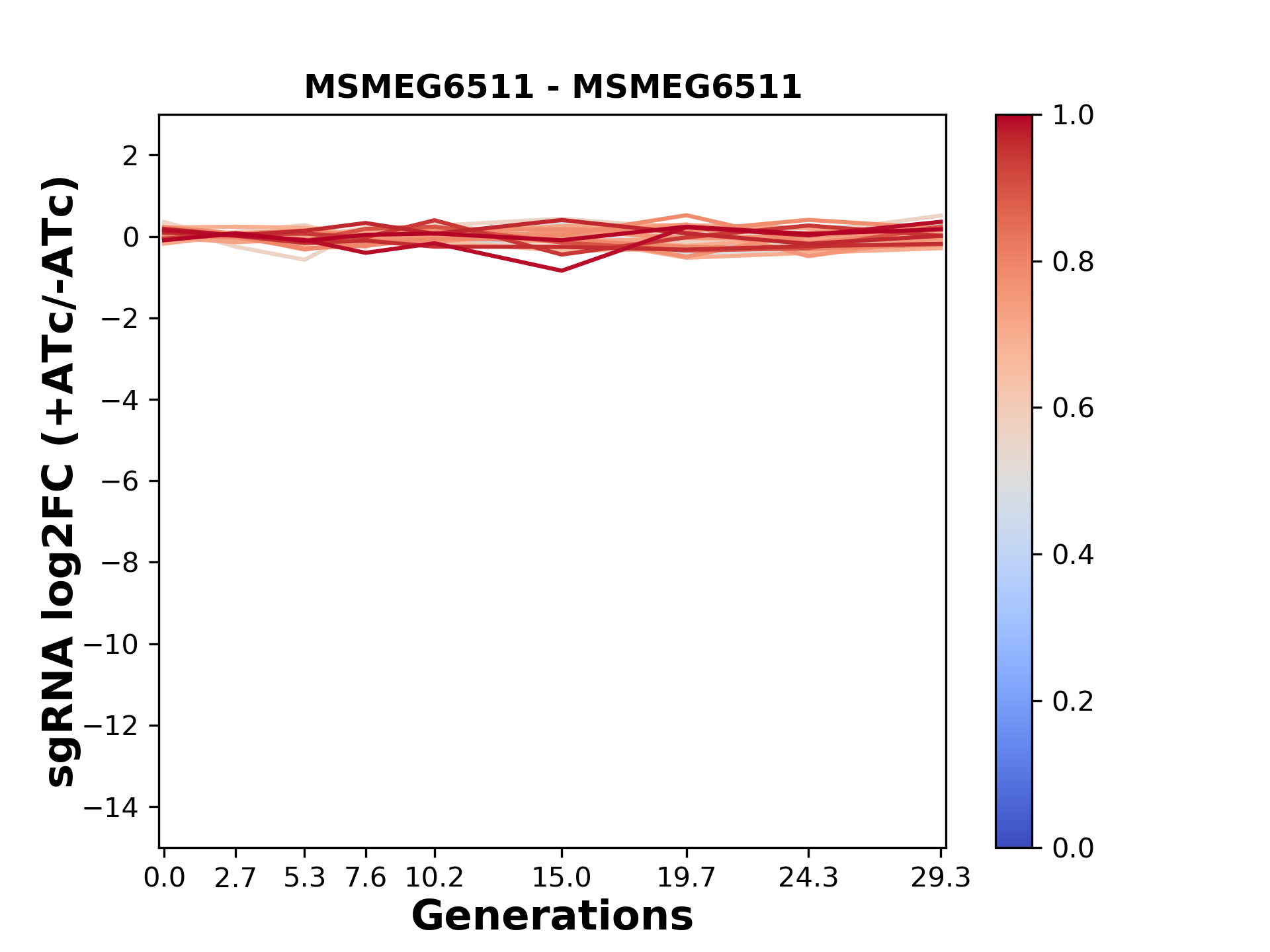 Here, we show sgRNA log2 fold-change values (L2FC) (plus versus minus ATc) over consecutive generations for sgRNAs targeting the gene you selected.