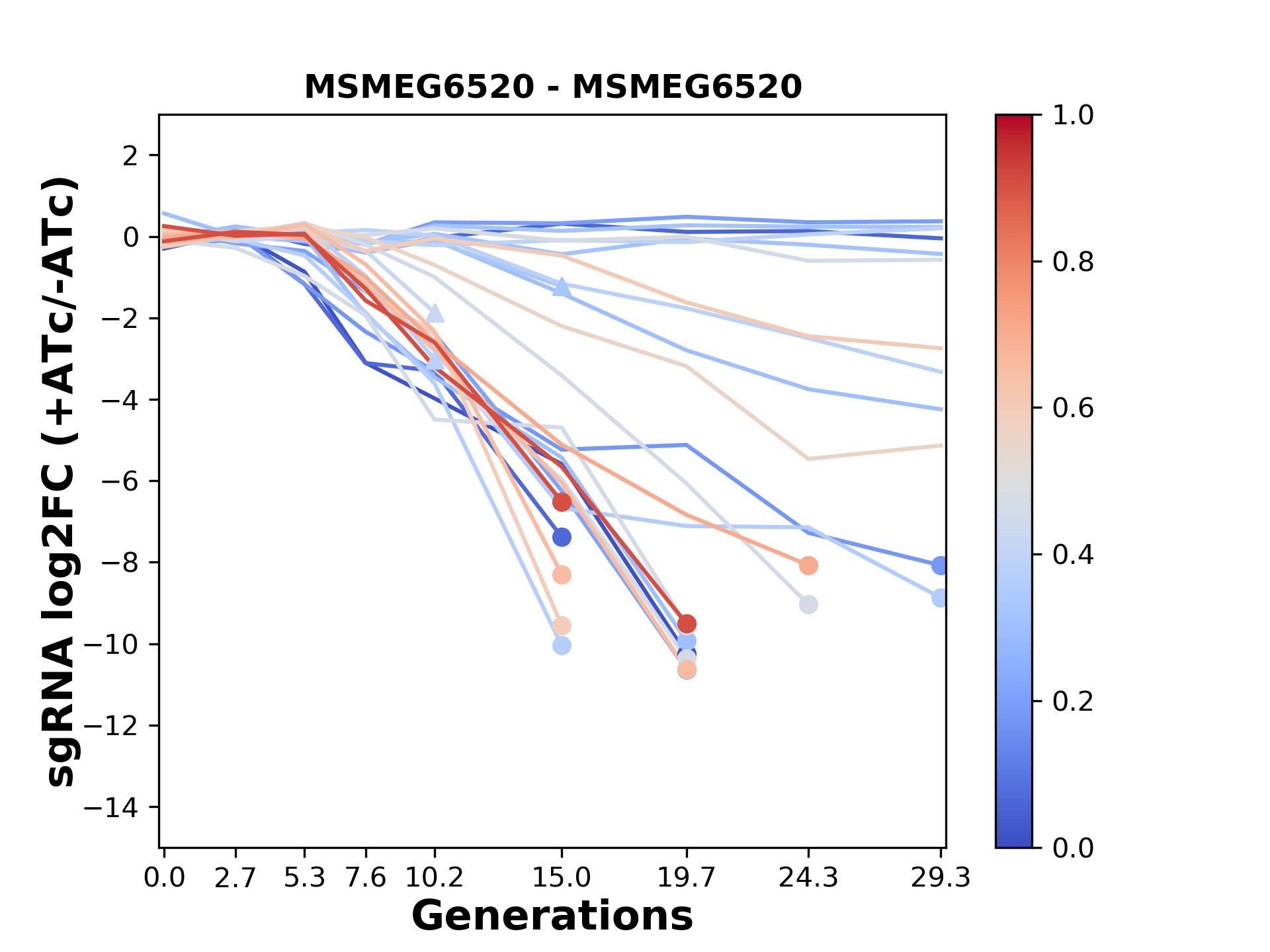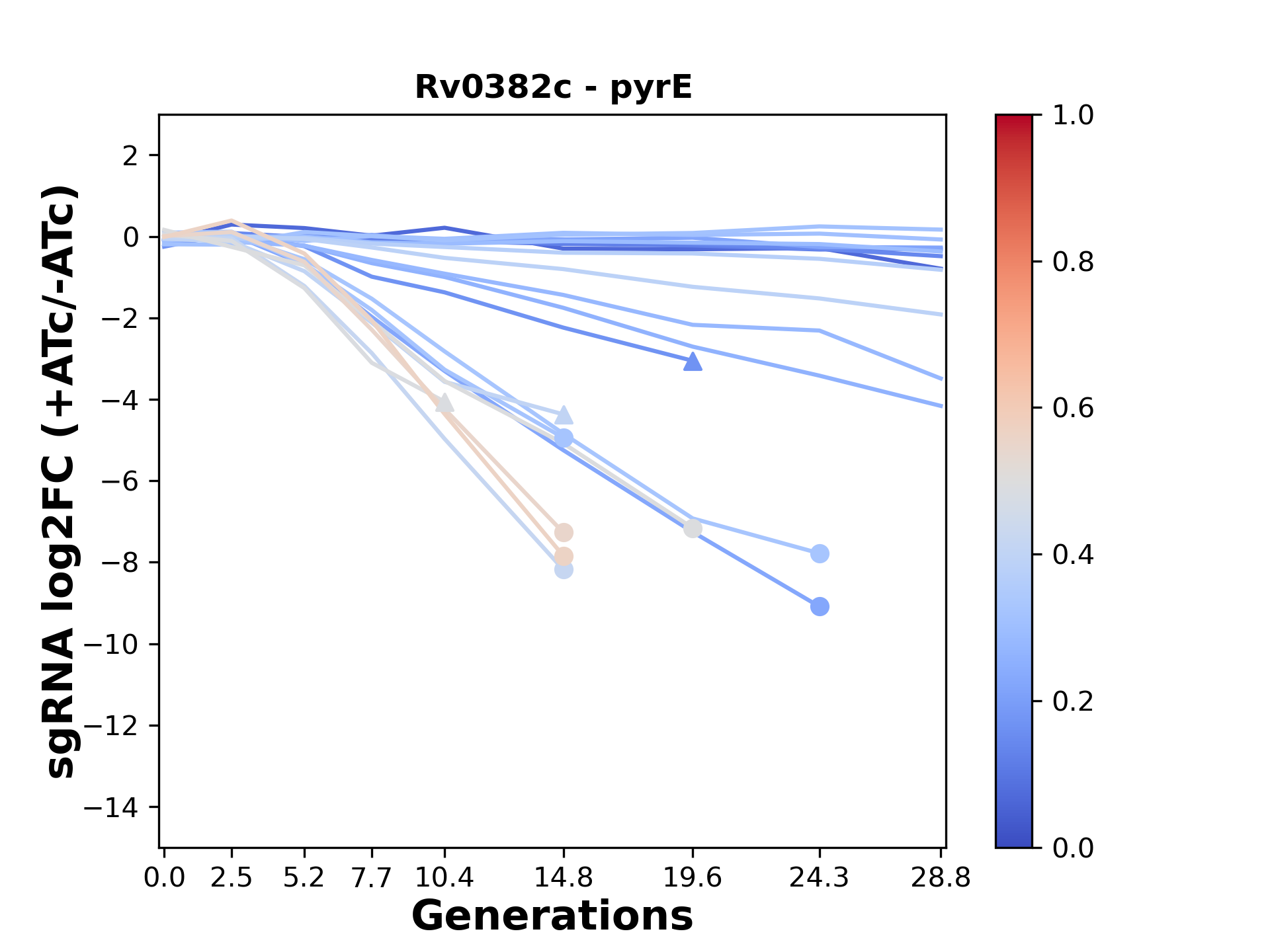 Here, we show sgRNA log2 fold-change values (L2FC) (plus versus minus ATc) over consecutive generations for sgRNAs targeting the gene you selected.