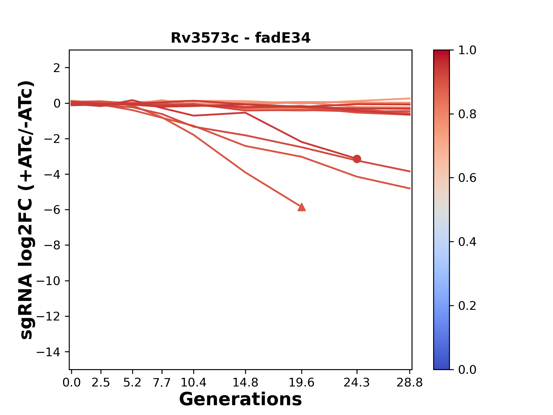 Here, we show sgRNA log2 fold-change values (L2FC) (plus versus minus ATc) over consecutive generations for sgRNAs targeting the gene you selected.