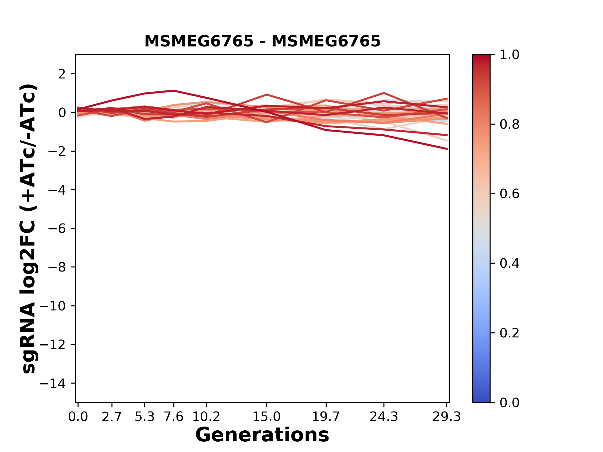 Here, we show sgRNA log2 fold-change values (L2FC) (plus versus minus ATc) over consecutive generations for sgRNAs targeting the gene you selected.