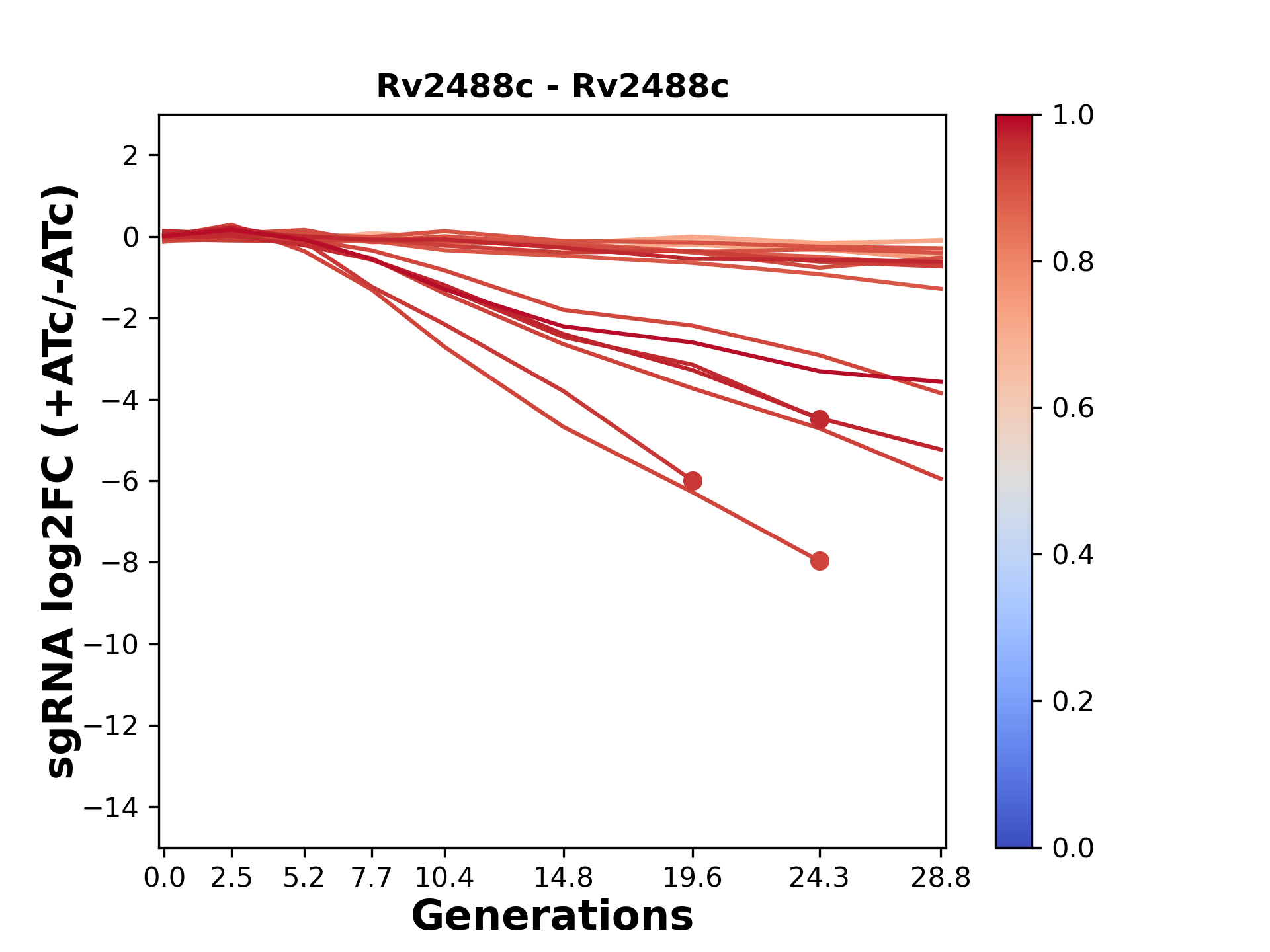 Here, we show sgRNA log2 fold-change values (L2FC) (plus versus minus ATc) over consecutive generations for sgRNAs targeting the gene you selected.
