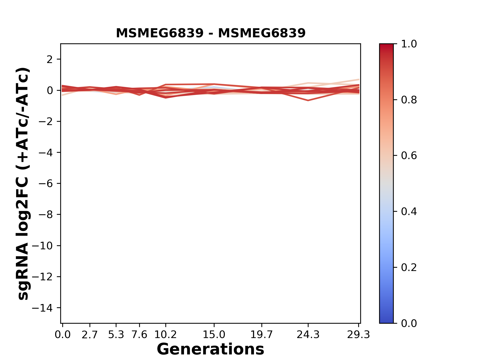 Here, we show sgRNA log2 fold-change values (L2FC) (plus versus minus ATc) over consecutive generations for sgRNAs targeting the gene you selected.