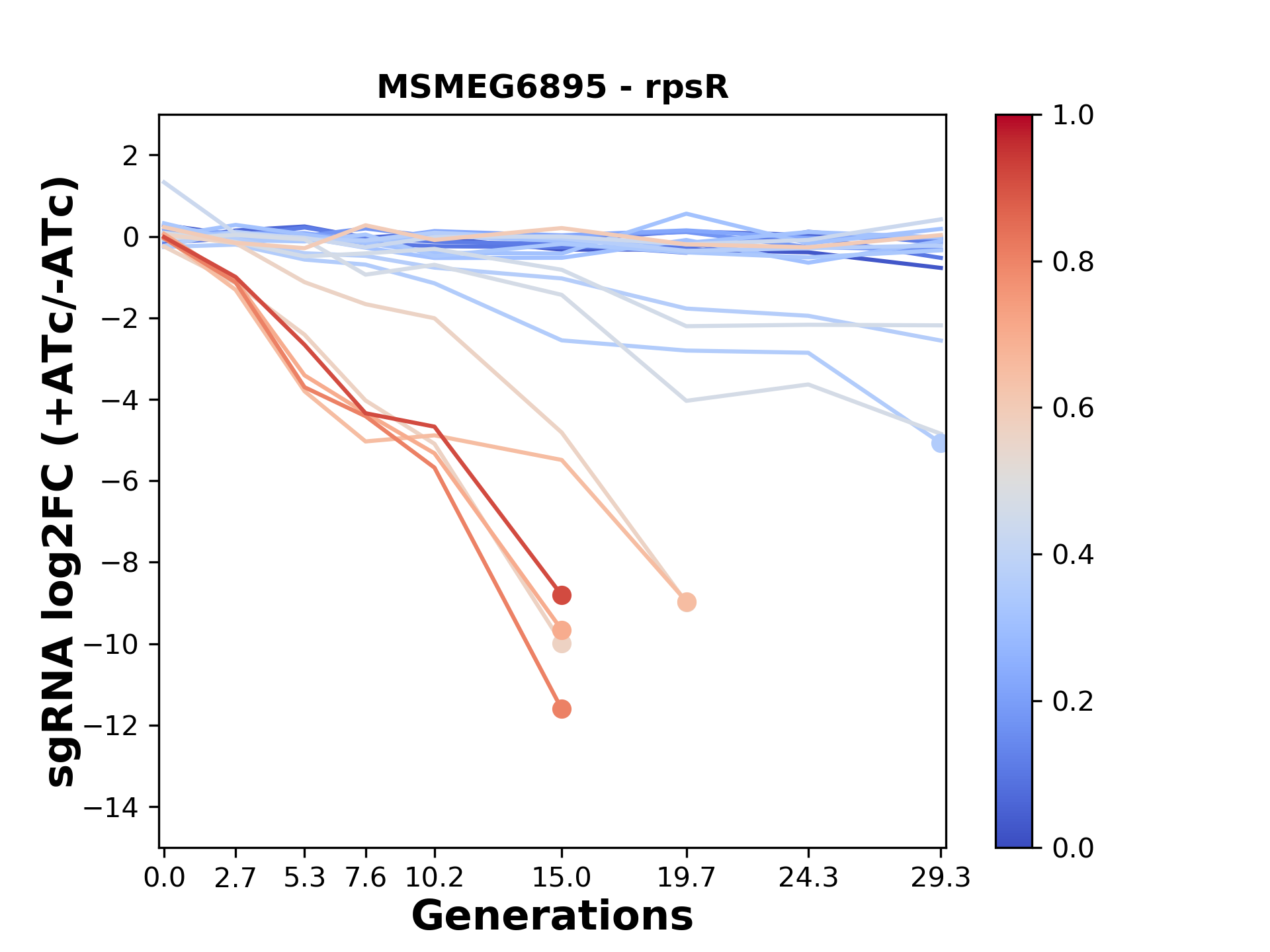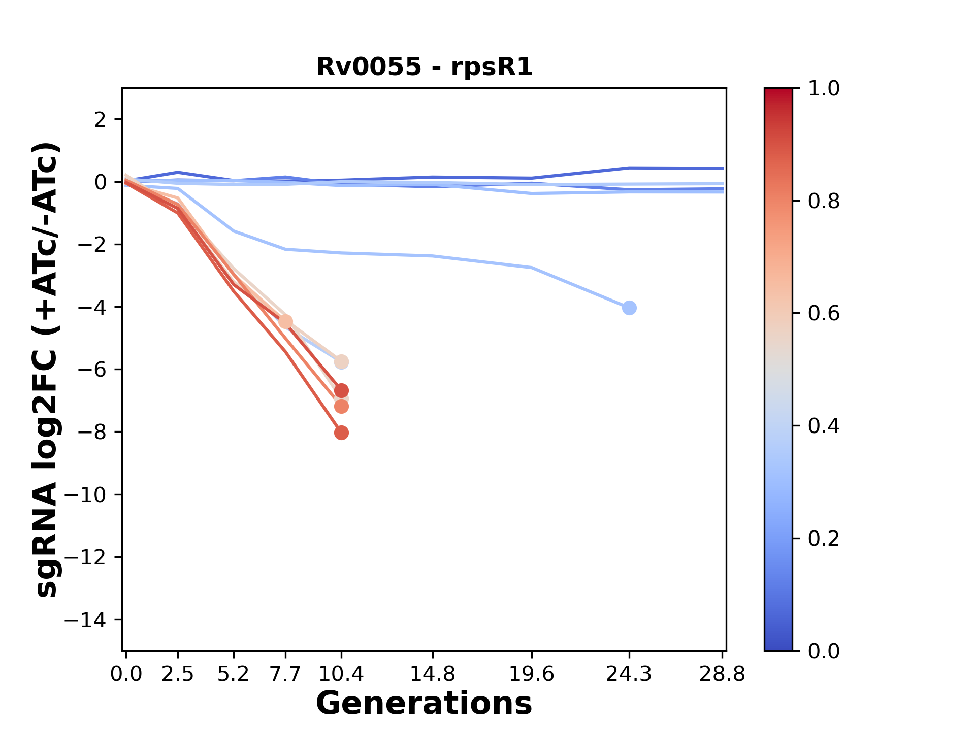 Here, we show sgRNA log2 fold-change values (L2FC) (plus versus minus ATc) over consecutive generations for sgRNAs targeting the gene you selected.