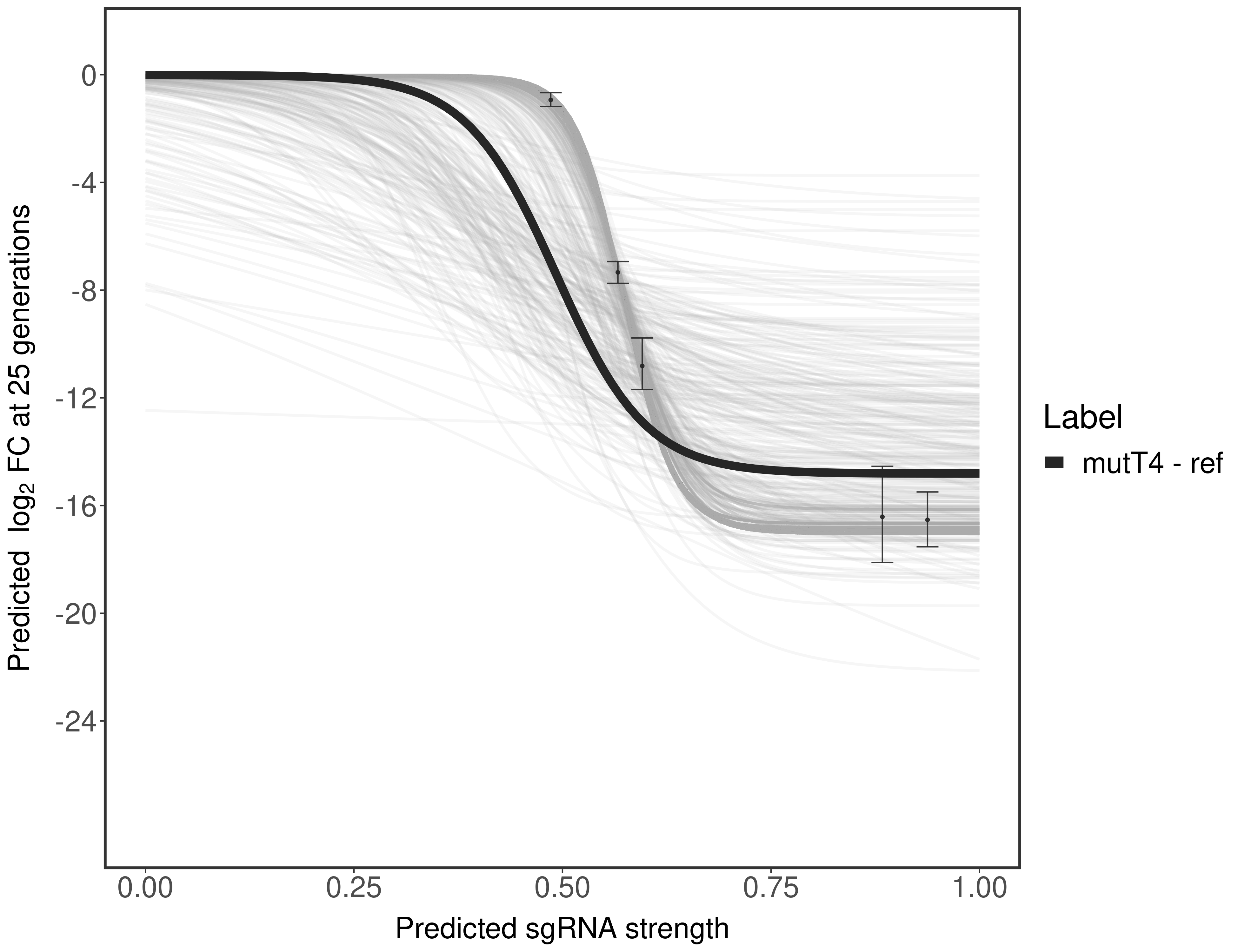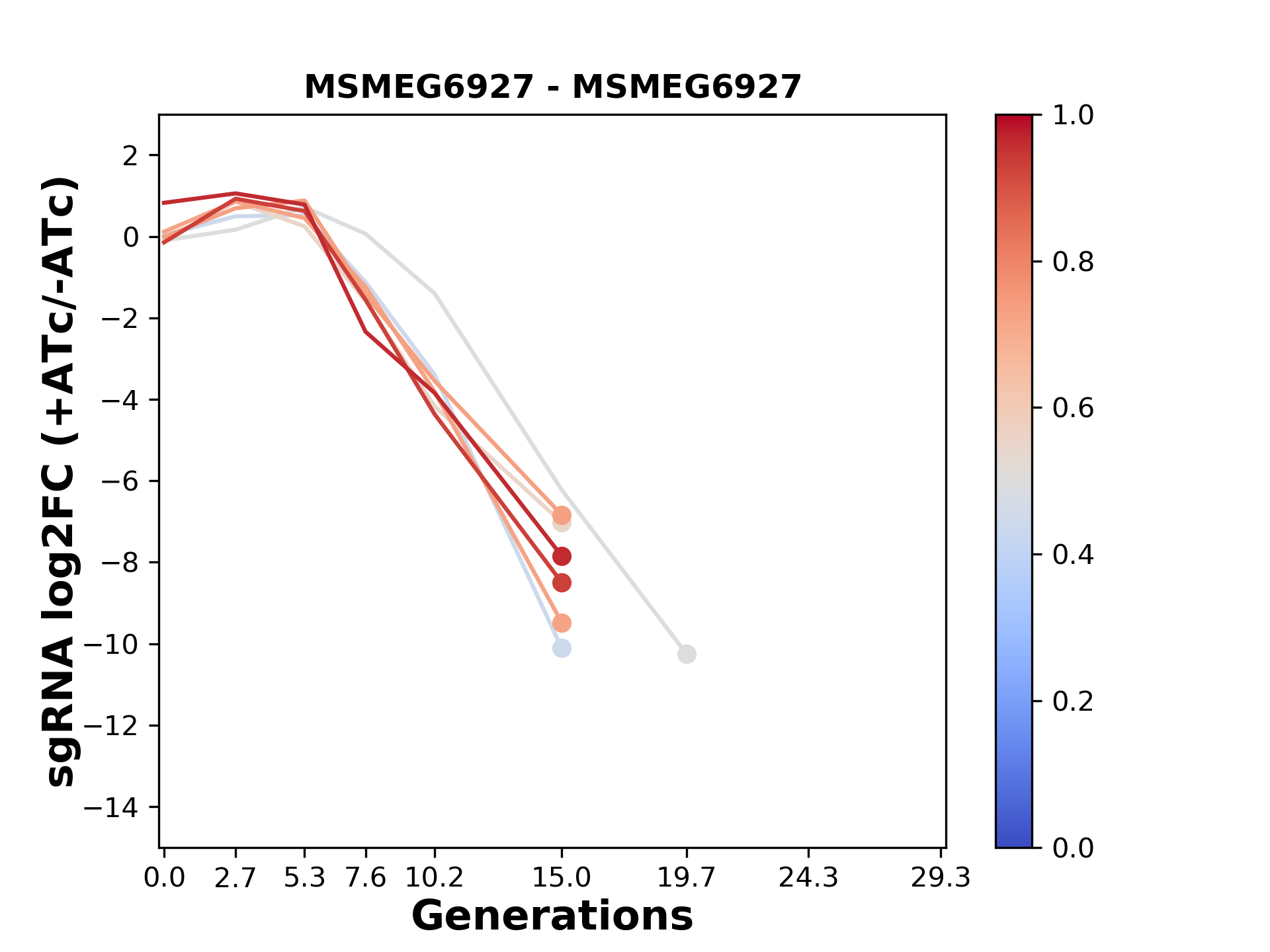 Here, we show sgRNA log2 fold-change values (L2FC) (plus versus minus ATc) over consecutive generations for sgRNAs targeting the gene you selected.