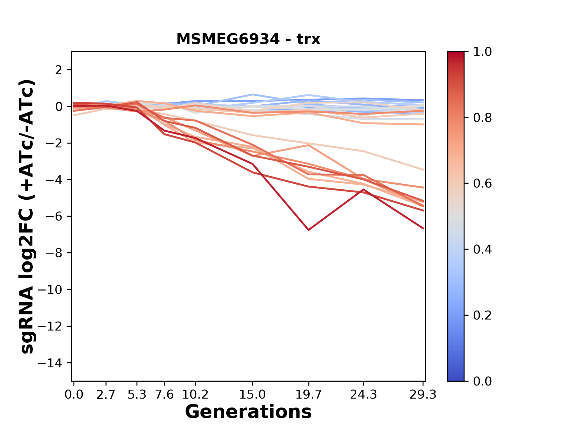 Here, we show sgRNA log2 fold-change values (L2FC) (plus versus minus ATc) over consecutive generations for sgRNAs targeting the gene you selected.